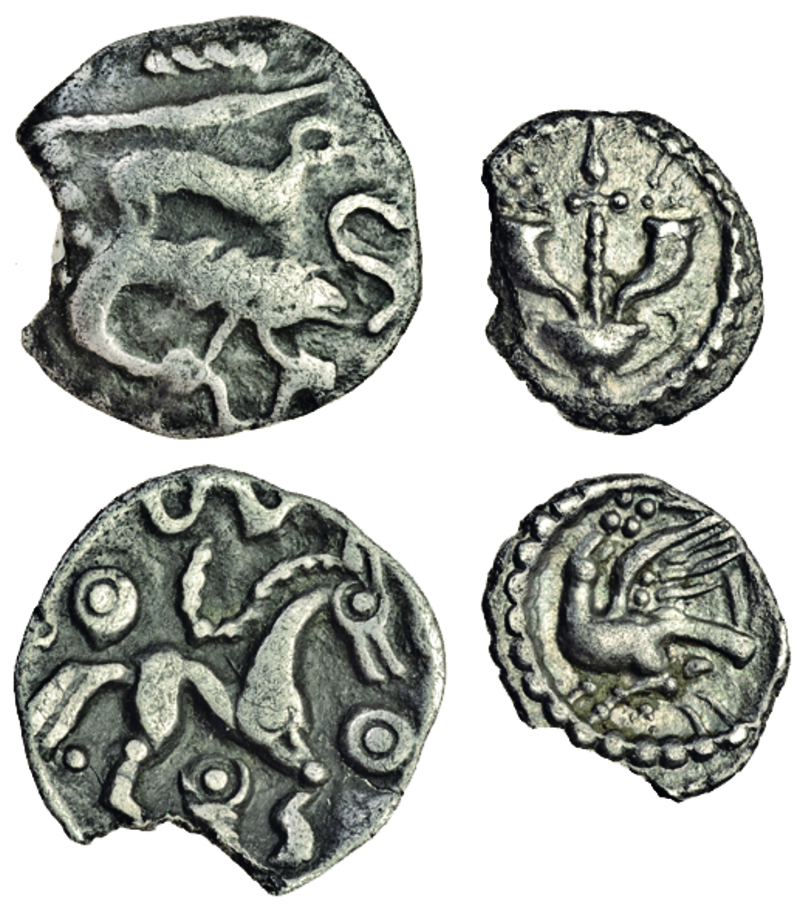 Celtic, North Thames, uninscribed coinage, ?c.55-45 BC, silver Half-Unit, 0.45g, 'Essex eagle' type, bird left holding snake in beak, rev. horse right between ring pellets, inverted corn ear below (Mack -; BMC 653; Rudd ABC 2309; S-), chipped, nearly very fine, extremely rare, Regni and Atrebates, Verica, silver Minim, 0.23g, cornucopiae type, two cornucopia divided by thyrsus above a wine cup, rev. eagle flying left looking back (Mack -; BMC 1543-58; Rudd ABC 1322; S.154), chipped, extremely fine, scarce (2)