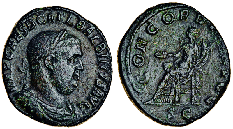 Balbinus (238), Sestertius, Rome, laureate, draped and cuirassed bust right, rev. concordia avgg, s-c, Concordia seated left, holding patera and double cornucopia (RIC 22; BMC 18; C. 4), dark green-brown patina, almost very fine