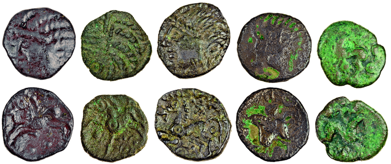 Celtic (5), Catuvellauni (4), Addedomaros, bronze Units (3), 1.05g, 'solar flower' type (Mack 274; BMC 2450-52; Rudd ABC 2541; S.206), good fine, scarce, 1.58g, corded head type, (Mack 273; BMC 2453-60; Rudd 2544; S.206), dark tone, about very fine, 1.60g, similar, even light brown tone, fine, uninscribed coinage, ?c.40 BC, bronze Unit, 1.38g, 'Essex stag' type, (Mack -; BMC 403; Rudd ABC 2312; S.-), about fine, extremely rare, Trinovantes, Dubnovellaunos (c.5 BC-AD 10), bronze Unit, 1.43g, 'hairy type,' (Mack 281; BMC 2446-48; Rudd ABC 2407; S.211), fair, rare (5)