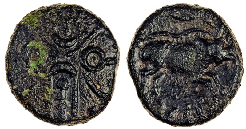 Celtic, Catuvellauni, Tasciovanos, bronze Unit, 2.47g, boar type, wreath and symbols, rev. boar running to right, vir below, crescent above (Mack 179; BMC 1702-05; Rudd ABC 2667; S.242), even dark patina, bold boar, good very fine, scarce