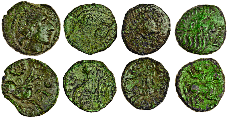Celtic Catuvellauni (4), Tasciovanos, bronze fractional Unit, 0.92g, goat type, ver before, rev. goat right (Mack 182; BMC 1765-68; Rudd ABC 2709; S.256), nearly very fine, rare, Andoco (c.20-1 BC), bronze Unit, 1.66g, head left andoco before, rev. horse right and-o-c-o around (Mack 200; BMC 2018-20; Rudd ABC 2727; S.265), flan edge bent at twelve o'clock, very fine, Dias (c.AD 1-10), bronze Unit, 1.27g, throne type, head right, inscription before, rev. figure seated left on throne (Mack 177; BMC 1639-44; Rudd ABC 2751; S.251), fine, very rare, Rues (c.AD 1-10), bronze Unit, 2.09g, bearded head right, [r]vii, before, rev. horseman right, r[vii] to right (Mack 190; BMC 1698-1701; Rudd ABC 2754; S.272), green patina, very fine, scarce (4)