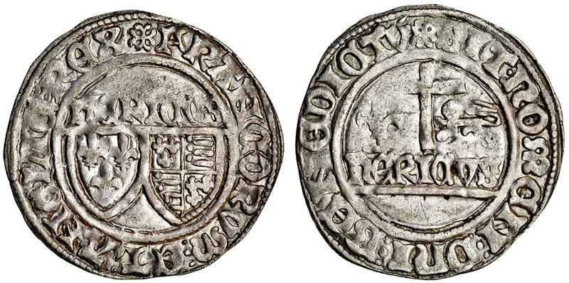 Henry VI, Grand Blanc aux Écus, 2.97g, Auxerre, m.m. cross ancrée, shields of France and England, simplifed leopards in English shield, rev. cross dividing lis and leopard, hericvs below (Elias 281), on a large flan, very fine, rare