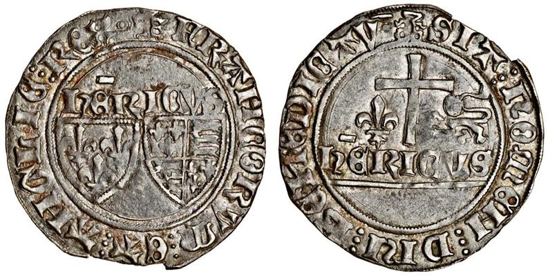 Henry VI, Grand Blanc aux Écus, 3.06g, Le Mans, m.m. root, shields of France and England, rev. cross dividing lis and leopard, hericvs below (Elias 285), edge chip, lightly toned, very rare, rare