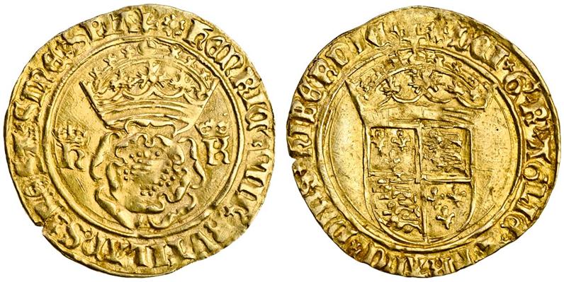 Henry VIII, second coinage 1526-44, Crown of the Double Rose, 3.60g, m.m. rose, lombardic lettering, crowned rose dividing crowned h and k, spia, rev. crowned shield, dms hibernie (Schneider 581-2; N.1788; S.2273), small edge nick at 8 o'clock, very fine