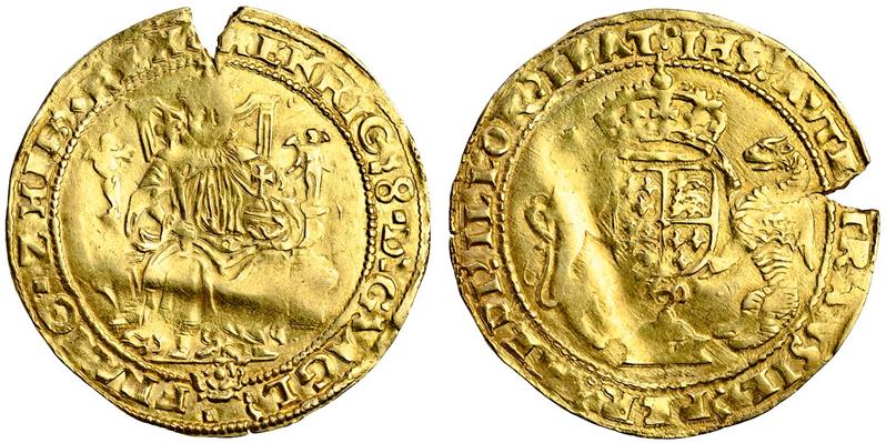 Edward VI (1547-53), coinage in the name of Henry VIII, 1547-51, Half-Sovereign, 6.05g, Tower, m.m. uncertain, king, crowned, seated facing on throne holding sceptre and orb, rose below, lozenge stops rev. crowned shield with supporters, grapple below (Schneider 658; N.1865; S.2393), flan edge split at 12 o'clock, crease, fine, rare