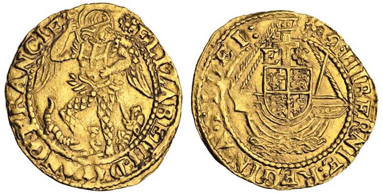 Elizabeth I, third and fourth issues, 1561-78, Quarter Angel, 1.30g, m.m. eglantine, St Michael spearing dragon, rev. shield within ship, cross above dividing e and a rose (Schneider 775; N.1993; S.2518), very fine, rare