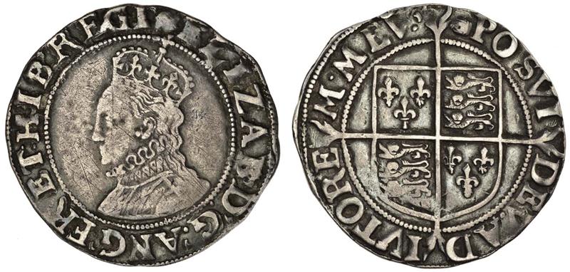 Elizabeth I, sixth issue, 1582-1600, Shilling, 5.89g, m.m. woolpack over tun / tun, crowned bust left, rev. shield over long cross fourchee (N.2014; S.2577), good fine
