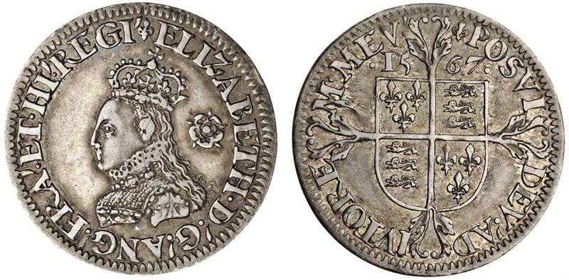 Elizabeth I, milled coinage, 1561-70, Sixpence, 2.99g. 1567, m.m. lis, crowned bust bust left, bust F, regi', rev. shield over long cross fourchée (Borden and Brown 38 O1/R2; N.2030; S.2599), lightly toned, good very fine