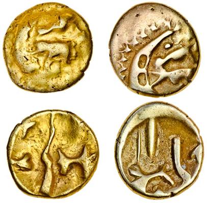 Celtic, imported coinage c.60-50 BC, Morini, Gold Quarter Staters (2), 1.48g, degenerate head, rev. tree like object (Mack 41; Scheers 13; Rudd ABC 40; S.10), nearly very fine, 1.42g, similar, fine (2)