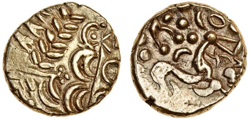 Celtic, uninscribed coinage, Corieltauvi c.50 BC, Gold Stater, 6.00g, North East coast type, degenerate head, right, rev. horse right, symbols in fields (Mack 51; BMC 184-91; Rudd ABC 1719; S.28), very fine