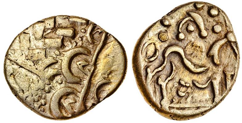 Celtic, uninscribed coinage, Corieltauvi, Gold Stater, 5.72g, North East Coast type, head right, rev. disjointed horse left, symbol below (Mack 51; BMC 184-91; Rudd ABC 1719; S.28), nearly very fine