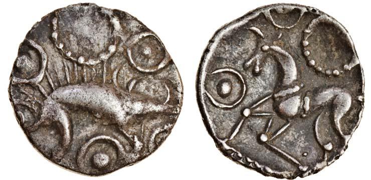 Celtic, Corieltauvi, uninscribed coinage, c.40-10 BC, Silver Unit, 1.33g, boar / horse type, boar right, ring symbols around, rev. horse left, ring pellet before, pellet ring above (Mack 405; cf BMC 3207; Rudd ABC 1797; S.396), well-centred with good detail of horse and boar, unusual with horse facing left, good very fine
