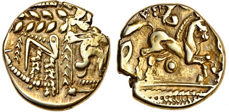 (x) Celtic, uninscribed coinage, Catuvellauni, Gold Stater, 5.78g, early Whaddon Chase type, c.55-45 BC, stylised head, rev. horse right, wing above, ground line below (Mack 135; BMC 295-330; Rudd ABC 2433; S.32), very fine