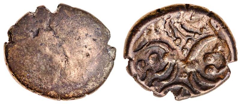 Celtic, uninscribed coinage c.50 BC, base Gold Stater, 4.46g, Savernake Forest type, plain with trace of design, rev. horse right, wheel below, various symbols in fields (Mack 62; BMC 361-64; Rudd ABC 2091; S.37), edge split, nearly very fine, rare
