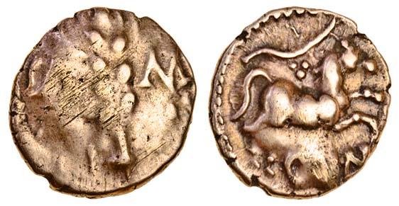 Celtic, Catuvellauni and Trinovantes, Cunobelin, Gold Quarter Stater, 1.35g, plastic type, corn ear, dividing ca-m, rev. horse right, branch with three pellets above, cvn below (Mack 204; BMC 1846-48; Rudd ABC 2816; S.294), about fine / nearly very fine, scarce