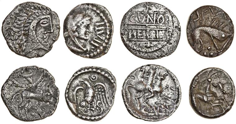 Celtic, Silver units (4), Iceni (2), 1.00g, boar right, rev. horse with halter right (Mack 407; BMC 3445-54; Rudd ABC 1576; S.431), about very fine, rare, 1.03g, head right, rev. horse right (Mack 413; BMC 3556-3604; Rudd ABC 1564; S.434), porosity, about very fine, Regni and Atrebates, Epaticcus, silver Unit, head right, rev. eagle (Mack 263; BMC 2024-2293; Rudd ABC 1346; S.356), obverse off-centre, porosity, good fine, Trinovantes and Catuvellauni, Cunobelin, 1.17g, inscription in two lines on panel, star above and below, rev. horseman right cvn below (Mack 216; BMC 1862; Rudd ABC 2858; S.302), fine, very rare (4)