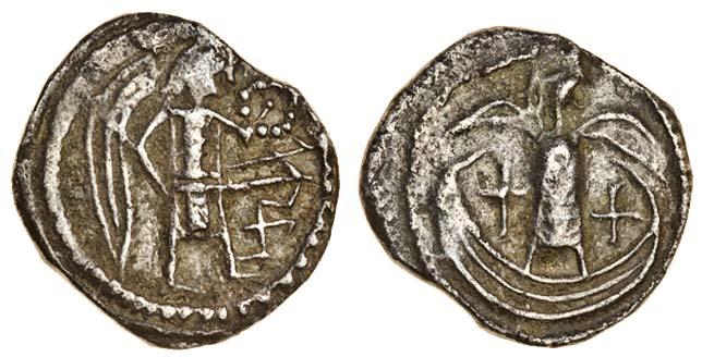 Anglo-Saxon, secondary series, c.710-60, Sceatta, 1.05g, type 22, victory type, winged figure standing right holding wreath, runes before ?aeth., rev. facing winged victory within boat dividing two crosses (cf Abramson Vi20; N.75/1; S.827), clear inscription, nearly very fine, an very rare type