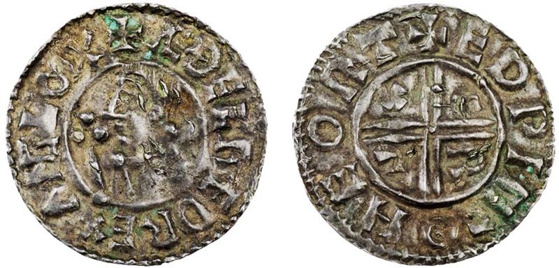 Aethelred II, Penny, 1.44g, Crux type, Hertford, Eadwi, draped bust left, sceptre before, rev. +edþi m-o heort, voided short cross, a letter of crvx in angles (N.770; S.1148), obverse weakness, very fine, scarce