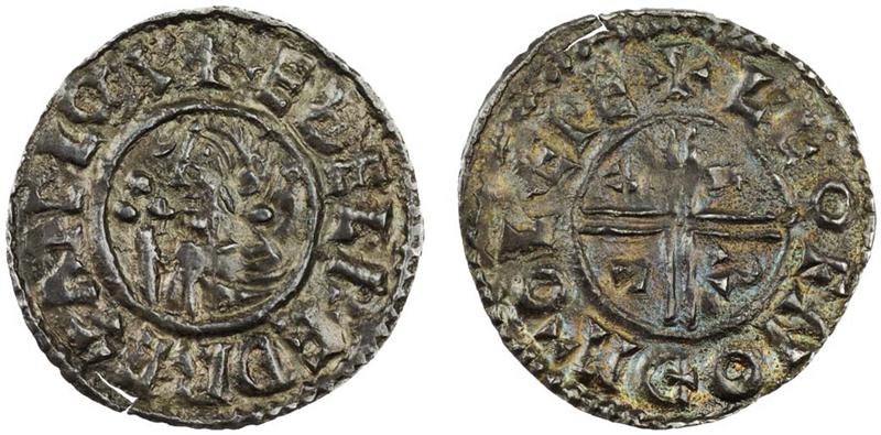 Aethelred II, Penny, 1.53g, Crux type, Lewes, Leofnoth, draped bust left, sceptre before, rev. +leofnoÐ m-o laeþe, voided short cross, a letter of crvx in angles (N.770; S.1148), minor edge split below bust, lightly toned, very fine