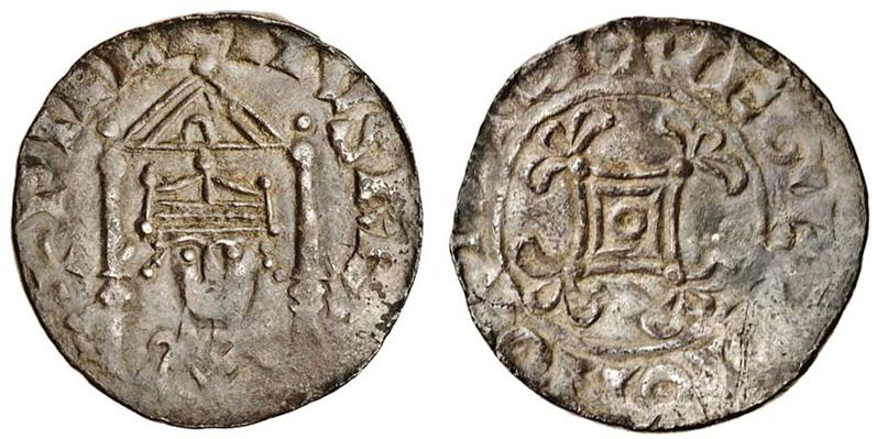 William I (1066-87), Penny, 1.18g, Canopy type, Oxford, Aegelwine, facing crowned bust under canopy supported by two columns, rev. +aegelþi on oxenef, quadrilateral with incurved sides, annulet at centre, fleurs on tips (N.843; S.1252), weak in places, crimping, an uncleaned field find, nearly very fine, very rare mint for this rare type