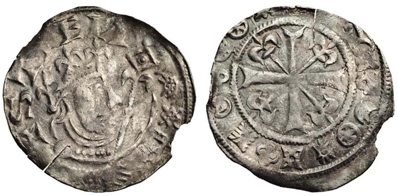 Stephen, local and irregular issues of the Civil War, York, Penny, 1.17g, ornamented types, crowned bust right, sceptre before with pellet in lozenge tip, +Stien, ornaments in legend to right of sceptre, rev. legend composed of ornaments, saltire fleury over cross pattée (N.920; S.1314), reverse off-centre, creased, test cut below bust, clear legends and detail, nearly very fine, an extremely rare irregular issue of the Civil War period