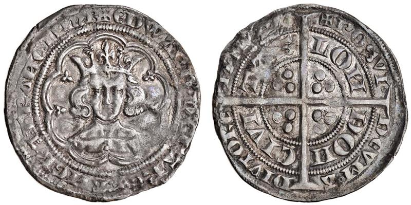 Edward III, fourth coinage, pre-treaty period, 1351-61, Groat, 4.43g, series B, London, m.m. cross 1, open e and c, Roman m, annulet stops, rev. civitas london, reverse barred ns (N.1142; S.1563), reverse off-centre, some light surface deposits in places, nearly very fine, rare