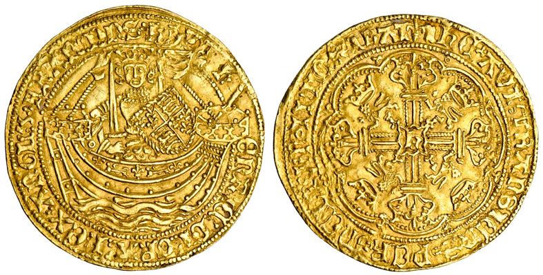 (x) Henry VI (first reign, 1422-61), annulet issue, 1422-30, Noble, 6.72g, continental imitation, group 2, m.m. -/lis, king, crowned facing in ship holding sword and shield, annulet by sword arm, no lis after henric, trefoil stops, rev. floriate cross, arms extending from central panel containing letter h, crowned leopards in angles, annulet in first spandrel, ihc before trefoil, annulet stops (cf Schneider 831), on a full large flan, extremely fine