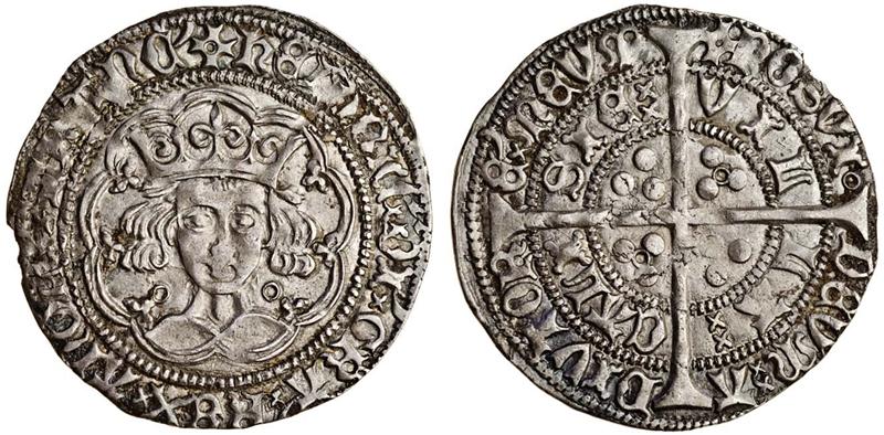 Henry VI, first reign, annulet issue, 1422-30, Groat, 3.73g, Calais, m.m. cross II, annulets by neck, no fleur on breast, rev. villa calisie, additional annulet in two angles (N.1424; S.1836), even grey tone, very fine