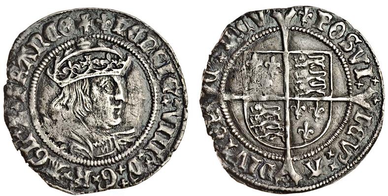 Henry VIII, second coinage, 1526-44, Groat, 2.35g, m.m. lis, crowned bust right, Laker D, france, rev. shield over long cross fourchée (N.1797; S.2337E), nearly very fine