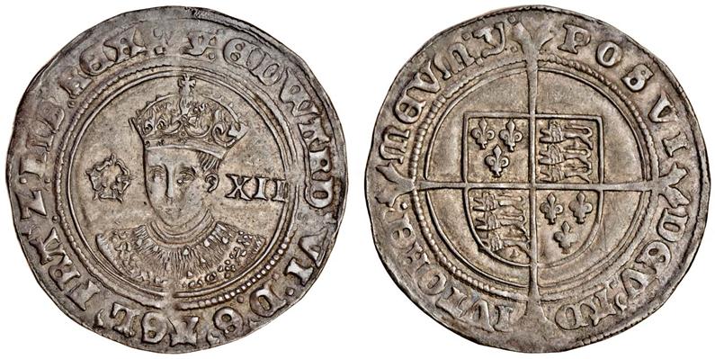 Edward VI, fine issue, 1551-53, Shilling, 5.96g, m.m. y, crowned facing bust half left, rev. shield over long cross fourchée (N.1937; S.2482), even grey tone, a good example with pleasing detail of bust, good very fine