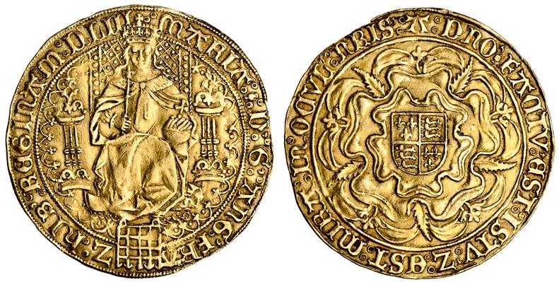 (x) Mary (sole rule, 1553-4), Fine Sovereign, 15.71g, mdliii (1553), m.m. pomegranate, queen, crowned, with flowing hair, seated on throne flanked by two pillars, portcullis below, annulet stops, rev. shield over rose (Schneider 706 -same dies; N.1956; S.2488), a little weak on face, very fine, rare