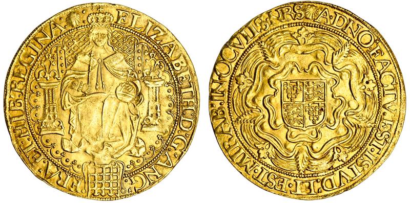 (x) Elizabeth I, sixth issue, 1582-1600, Sovereign, 15.21g, m.m. escallop, Queen enthroned holding orb and sceptre, portcullis at feet, double pellets on pillars of throne, pellet stops, rev. square topped shield on Tudor rose, pellet stops (Schneider 779-80; N.2003; S.2529), small x scratched by left pillar, a little weak on queen's face, attractive, good very fine, rare