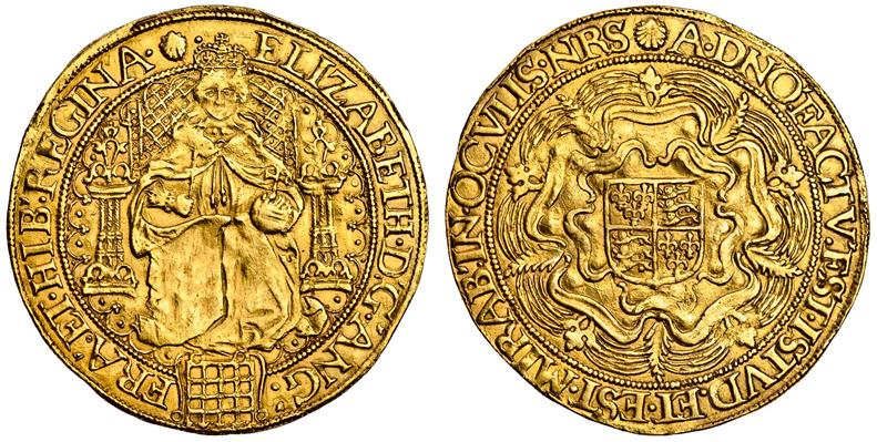 (x) Elizabeth I, sixth issue, 1582-1600, Sovereign, 15.05g, m.m. escallop, Queen enthroned holding orb and sceptre, portcullis at feet, pellet stops, rev., square topped shield on Tudor rose, pellet stops (Schneider 780-81; N.2003; S.2529), very fine, rare