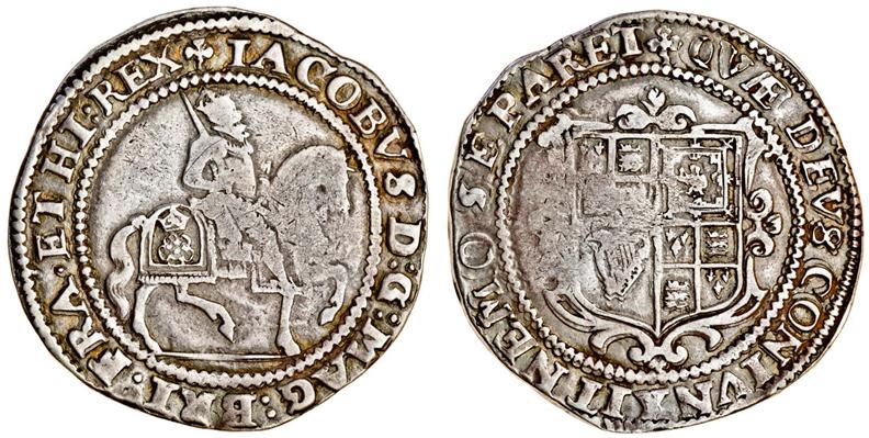 (x) James I, third coinage, 1619-25, Halfcrown, 14.76g, m.m. trefoil, king, crowned and holding sword, riding right, ground line below, rev. garnished shield (N.2122; S.2666), some weakness, very fine