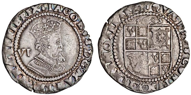 James I, third coinage, 1619-25, Sixpence, 3.08g, 1623, m.m. thistle, sixth crowned bust right, rev. square topped shield (N.2126; S.2670), lightly toned, good portrait, very fine
