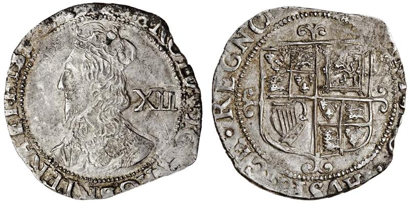 Charles I, Tower under Parliament, Shilling, 6.04g, group F, bust 2, m.m. eye, crowned bust left, rev. shield over cross moline (Brooker 558; N.2232; S.2800), mintmark part lost, irregular flan, good bust, very fine