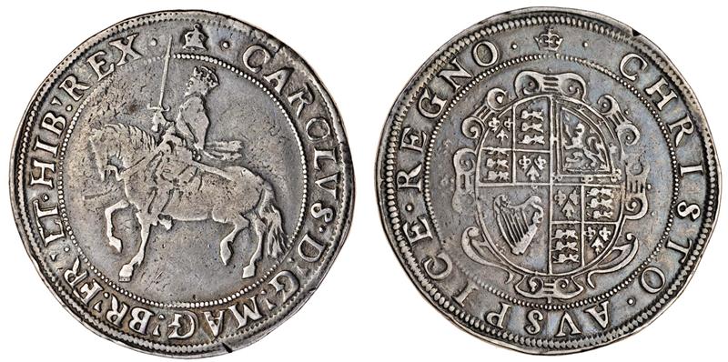Charles I, Crown, 29.29g, group III, type 3a, m.m. crown, king, crowned, riding left holding sword, rev. oval garnished shield (Brooker 258; N.2195; S.2758), nearly very fine