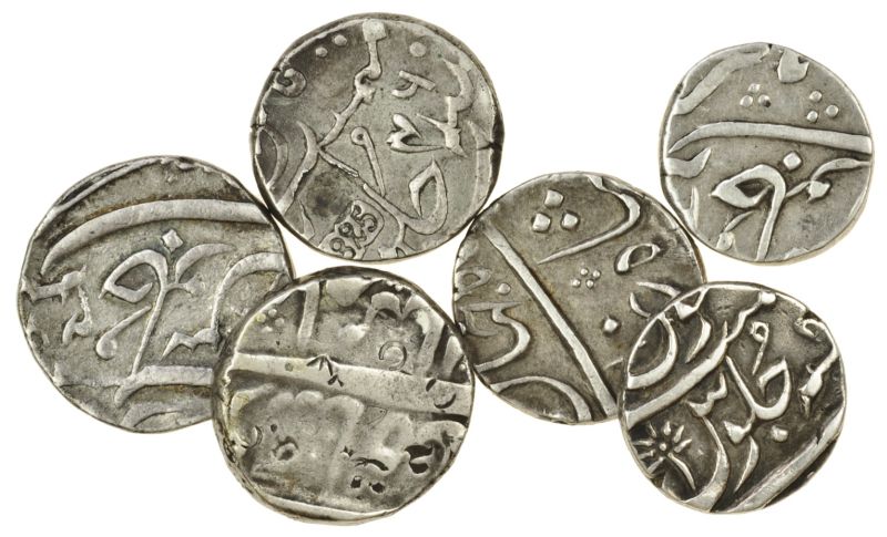 East India Company, Bombay Presidency, Dump Rupees (2), Surat, undated (1800-1832), dated 1825; Half-Rupees (3), Surat, in the name of Shah Jahan II, ry.ahd, Surat, undated (1800-1832), Mumbai, date unclear, together with a country-made Rupee, ry.34 (KM.175, A177, 211.1, 218.2, 212,1), the last about fine with many test marks, about very fine to about extremely fine, the Half-Rupee of Shah Jahan II scarce (6)