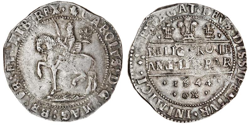 (x) Charles I, Civil War coinages, Oxford, 1642-46, Halfcrown, 14.88g, 1644, m.m. small Shrewsbury plume / lozenges, king, crowned, riding left, Oxford plume behind, rough ground below, rev. Declaration in two lines, large plume above dividing two smaller plumes, lozenge each side, below, date, .ox. (Brooker 909-10; N.2418/2425; S.2965), unusually good detail, good very fine, rare
