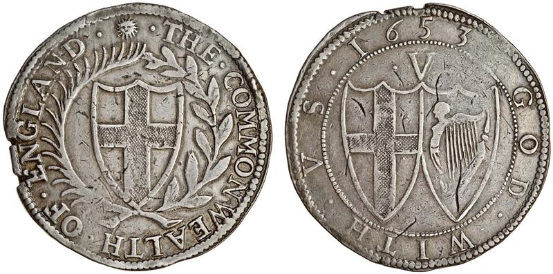Commonwealth, Crown, 29.98g, 1653, m.m. sun, shield within wreath, rev. conjoined shields (N.2721; S.3214), two edge splits at nine o'clock, some marks, nearly very fine