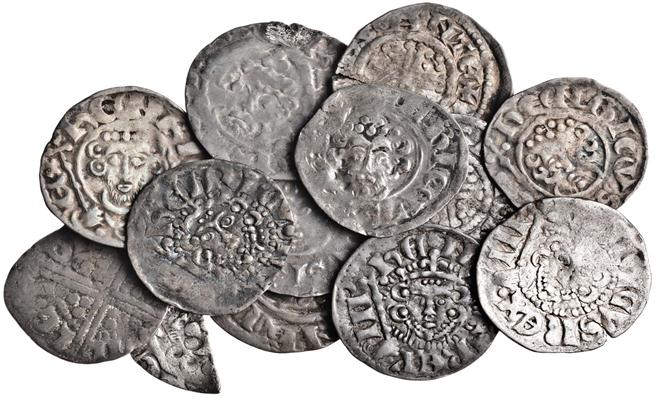 English hammered coins, Pennies (12), short cross coinage (8), cut half (1), Henry III (4), long cross coinage, Pennies (4), cut quarter (1) various classes and mints, one pierced, generally about fine (17)