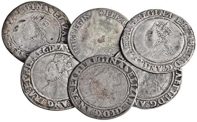 English hammered coins (6), Elizabeth I, Shillings (6), second issue 1560-61, (5), m.m martlet (2), cross crosslet (3), one with large bust (N.1985; S.2555, 2555A), generally fair - about fine, milled coinage, 1560-71, Shilling, small flan (N.2023; S.2592), fair (6)