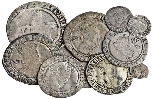 English hammered silver coins (10), James I (10), third coinage, Halfcrown, Shillings (3), first coinage (1), second coinage (2), Sixpences (3), 1603, 1605 (2), minor denominations (3), generally fair - about fine (10)