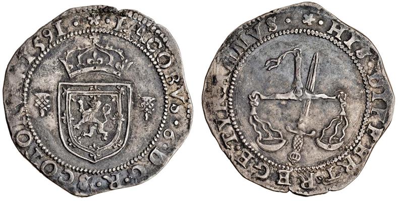 James VI (1567-1625), sixth coinage, balance Half Merk, 4.44g, 1591, crowned shield dividing two thistle heads, rev. balance over sword (S.5491), irregular flan, good detail, nearly very fine