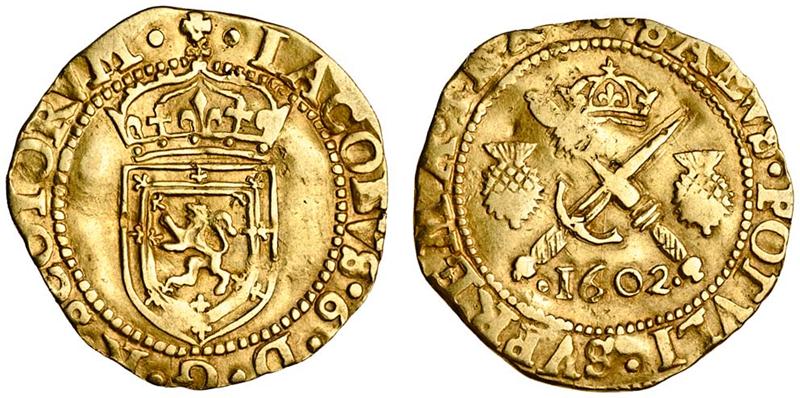 James VI, eighth coinage, Half-Sword and Sceptre Piece, 2.40g, 1602, crowned shield, rev. crossed sceptre over sword, crown above, thistle each side (S.5462), crimped, nearly very fine