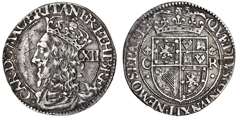 Charles I (1625-49), third coinage, 1637-42, Twelve Shillings, 5.23g, Faloner's first issue, crowned bust left, rev. crowned shield dividing crowned c r, inverted f above crown (S.5560), scuffs, nearly very fine
