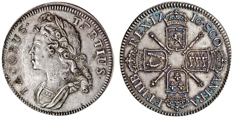Scotland, James III, 'The Old Pretender,' pattern Guinea in silver, 1716, dies by Norbert Roettiers, struck by M. Young, c.1828, laureate, cuirassed bust left, iacobvs tertivs, rev. four crowned shields cruciform, edge plain (S.5728), obverse flan flaws, reverse toned, nearly extremely fine, rare