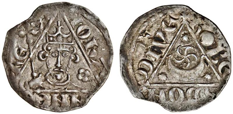 John, third 'rex' coinage, c.1207-11, Penny, 1.39g, Dublin, Roberd, facing crowned bust within triangle holding sceptre to left, quatrefoil to right, rev. sun and moon with three stars within triangle (D.F.50; S.6228), about very fine