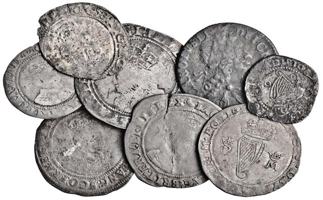 Irish hammered coins, silver (6), Edward VI, coinage in name of Henry VIII, Groat, this broken, Philip and Mary, Groat, Elizabeth I, Shilling, James I, Shillings (2), Sixpence, generally fair, AE, Elizabeth I, Penny, fair, milled AE, Charles II, Penny, 1681, fine (8)