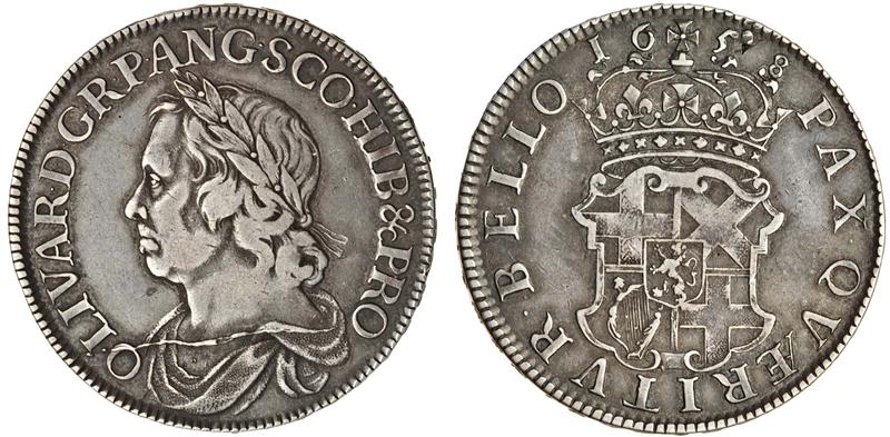 Cromwell, Crown, 1658/7, laureate, draped bust left, rev. crowned arms of the Protectorate, edge inscribed (ESC 10; S.3226), nick between 5 and 8 in date, usual well developed die crack on neck, nearly very fine
